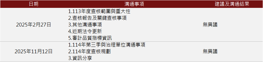 1.獨立董事與會計師至少每年一次定期會議,會計師就本公司財務狀況、國內外子公司財務及整體運作情形、IFRSs公報修訂及主管機關發佈與本公司相關之法令修訂事項向獨立董事進行報告,並針對有無重大調整分錄或法令修訂有無影響帳列情形充分溝通並針對與會人員所提問題進行討論,若遇重大異常事項時得臨時召集會議。