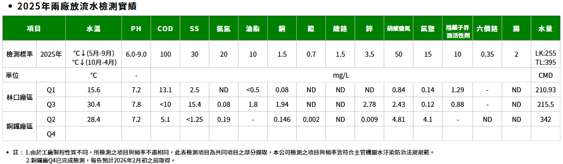 本公司林口廠及銅鑼廠每日法令規範之最高廢汙水排放量合計為686.07CMD,所產生之廢水種類,分為製程清洗廢水、洗滌塔廢水、酸性廢液與其它廢液。而為確實依循環保法令,所有廢水皆經妥善處理並嚴格檢測,核可後分別排放至林口之紅水仙溪與苗栗縣主要溪流之後龍溪。【2025年兩廠放流水檢測實績】