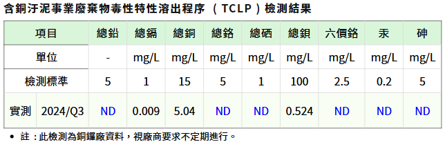 廢酸液體與含銅污泥這兩類有害事業廢棄物,本公司委託合格廠商進行清理,並定期追蹤,確保清除機構與處理機構皆依據合約與法令執行清運措施,降低廢棄物危害。以含銅污泥為例,我們委由合格廠商,分別進行清運、過磅、中間處理(固化處理)、最終處理(掩埋)之完整流程,其中固化物檢測結果之重金屬測值相當微量,符合法令規範標準,不造成環境的負擔。【廢棄物TCLP檢測結果】