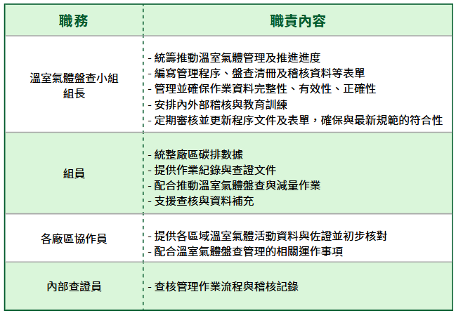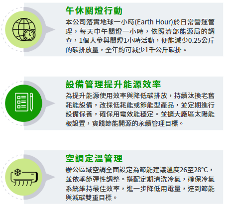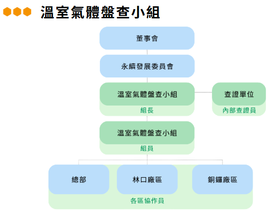 為能長期推動永續發展的最適路徑與對策,建立長期溫室氣體減量目標,於2024年成立「 溫室氣體盤查小組 」導入 ISO 14064-1 溫室氣體管理系統,建置碳盤查作業流程,包含量化方法、資料蒐集、內部查證作業;由永續發展委員會,將溫室氣體盤查執行相關進度與執行狀況每季向董事會報告。