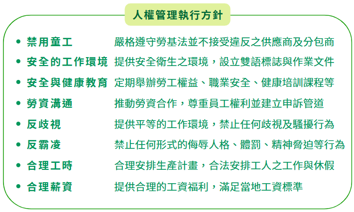 2024年至2025年辦理人權保障相關訓練,包含安全衛生課程、勞動法令講座、職場不法侵害防治、性騷擾防治等總時數 197小時,共計157人次完成訓練,並於公司官網正式發布《 永續發展聲明書 》內容涵蓋人權政策的承諾以保障同仁的基本權利。