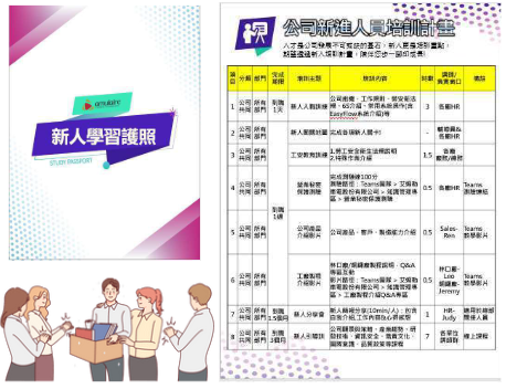 為使新人能快速適應工作環境融入團隊,除安排系列性新人訓練外,自2021年起推動「新人學習護照」,與新進夥伴分享更多工作相關資訊,並提供新人入職3個月內各部門應完成之通識課程,幫助新人學習成長;同時,也安排輔導員協助每一位新任,並提供各部門主要聯繫窗口處理相關問題,讓新人不再手足無措。