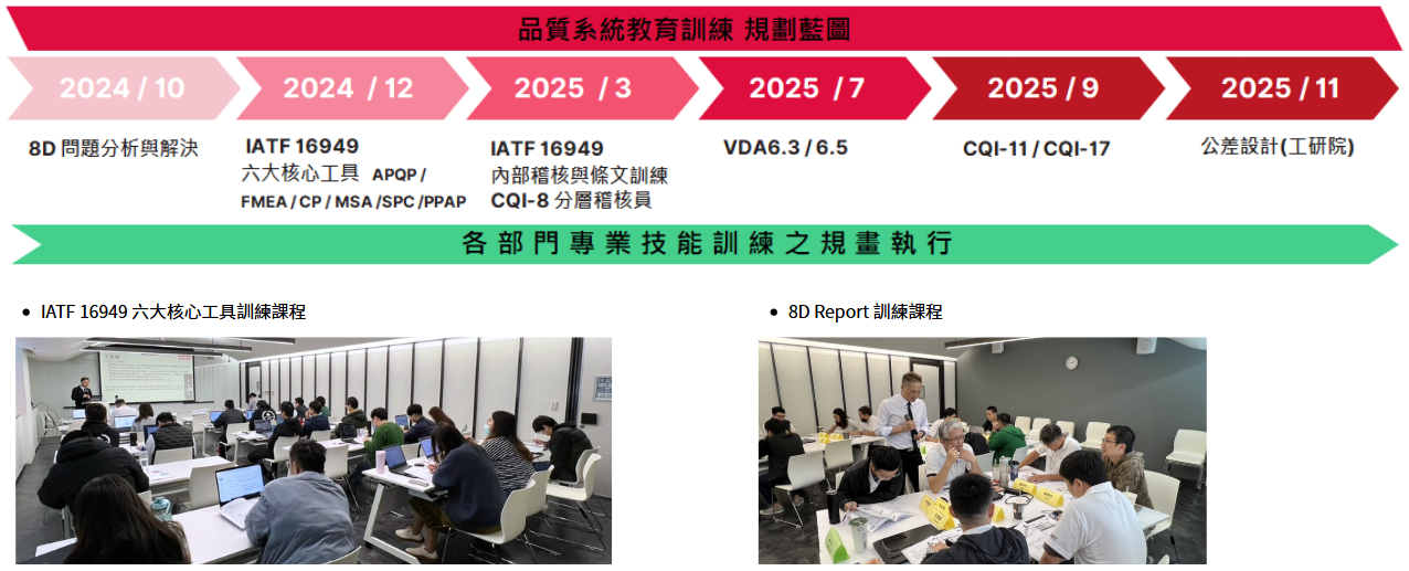 艾姆勒持續推動品質管理系統相關教育訓練,強化員工對於品質制度、IATF 16949六大核心工具與各項稽核要求之理解與實務應用能力,規劃品質系統訓練藍圖,透過系統化、階段性安排,建構從基礎工具導入到進階稽核實務的專業人才培育機制,厚植品質管理根基,強化企業永續營運韌性。