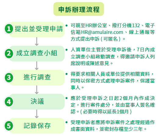 為落實誠信透明之企業文化,艾姆勒建立多元檢舉管道,同仁可透過申訴信箱或填寫申訴書,由法務人員及人資處負責受理申訴案件,保障員工合法權益。