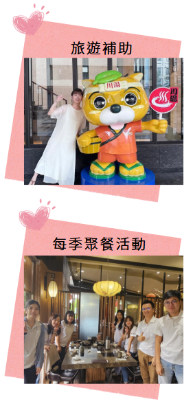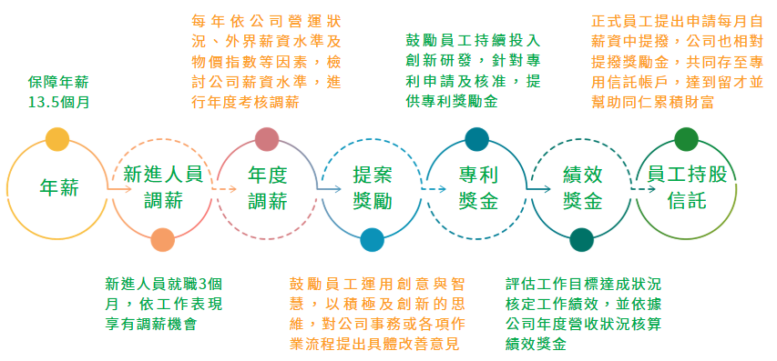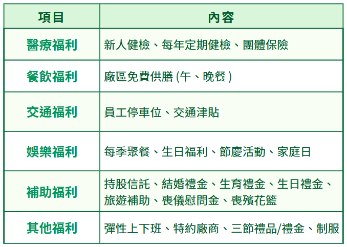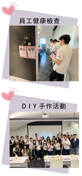 一連串關懷性活動及福利措施,例如:新人關懷餐會、新人導師制度、員工旅遊、健康檢查、員工運動會、尾牙、中秋餐會…等,並建立員工多元化申訴管道、提案獎勵等機制,快速反應員工意見。