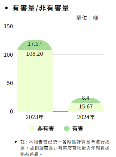 本公司優先考量營運所造成之環境風險,注重廢棄物處理,透過持續性宣導,查核辦公室及廠區的垃圾分類;落實有害廢棄物合法清運;定期查訪一般事業廢棄物清理廠商,了解其廢棄物之操作管理情形,避免汙染水、空氣噢周遭土地等公共資源,竭力降低環境污染,並確保符合法令規範,有關近兩年廢棄物量如下表。