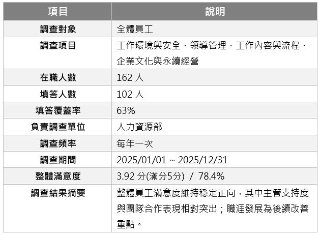 本公司人力資源部於2026年1月辦理 2025 年員工滿意度調查,以了解員工對公司工作環境、管理制度及組織合作等面向之感受,並針對調查結果進行分析,作為後續管理改善之重要依據。本次員工滿意度調查內容涵蓋工作環境與安全、領導管理、工作內容與流程、組織合作、企業文化與永續經營等面向,員工覆蓋率為63%,整體員工認同公司為78.4%呈現穩定且偏正向之趨勢,我們計畫於2026年達成80%(提升2%)員工認同公司的目標。