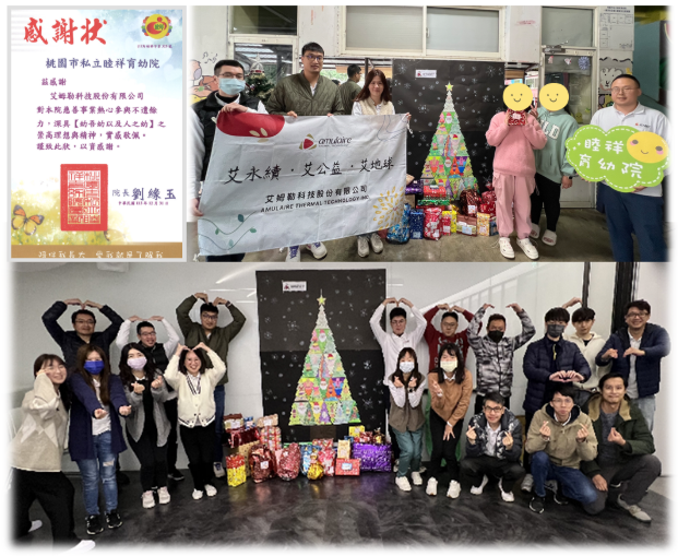 a.艾姆勒多年來(2017年起)持續陪伴育幼院的孩子們度過溫暖的聖誕節,2024年在聖誕節持續以愛心與行動,透過聖誕送暖活動,滿足孩子對節日的期待與童年願望。同仁們自主性的認購聖誕禮物共 25份 ( 約2萬元 ),並共同合作手工繪製聖誕樹一起送至育幼院為孩子布置。(機構鄰近林口總部、林口廠區所在區域的桃園私立睦祥育幼院的孩子25名)