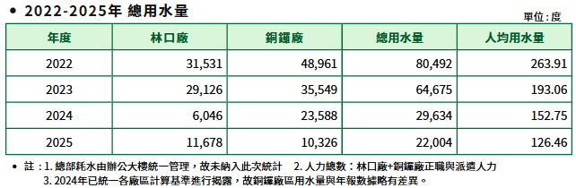 為提升水資源使用效率,本公司持續關注水資源議題,、廠端基礎設施檢修與耗水量改善 ,追求水資源使用率的提升,並積極對水資源利用與回收相關措施進行評估,輔以持續性員工節水環境教育宣導,期望透過不斷的努力,提升內部水資源使用效率。